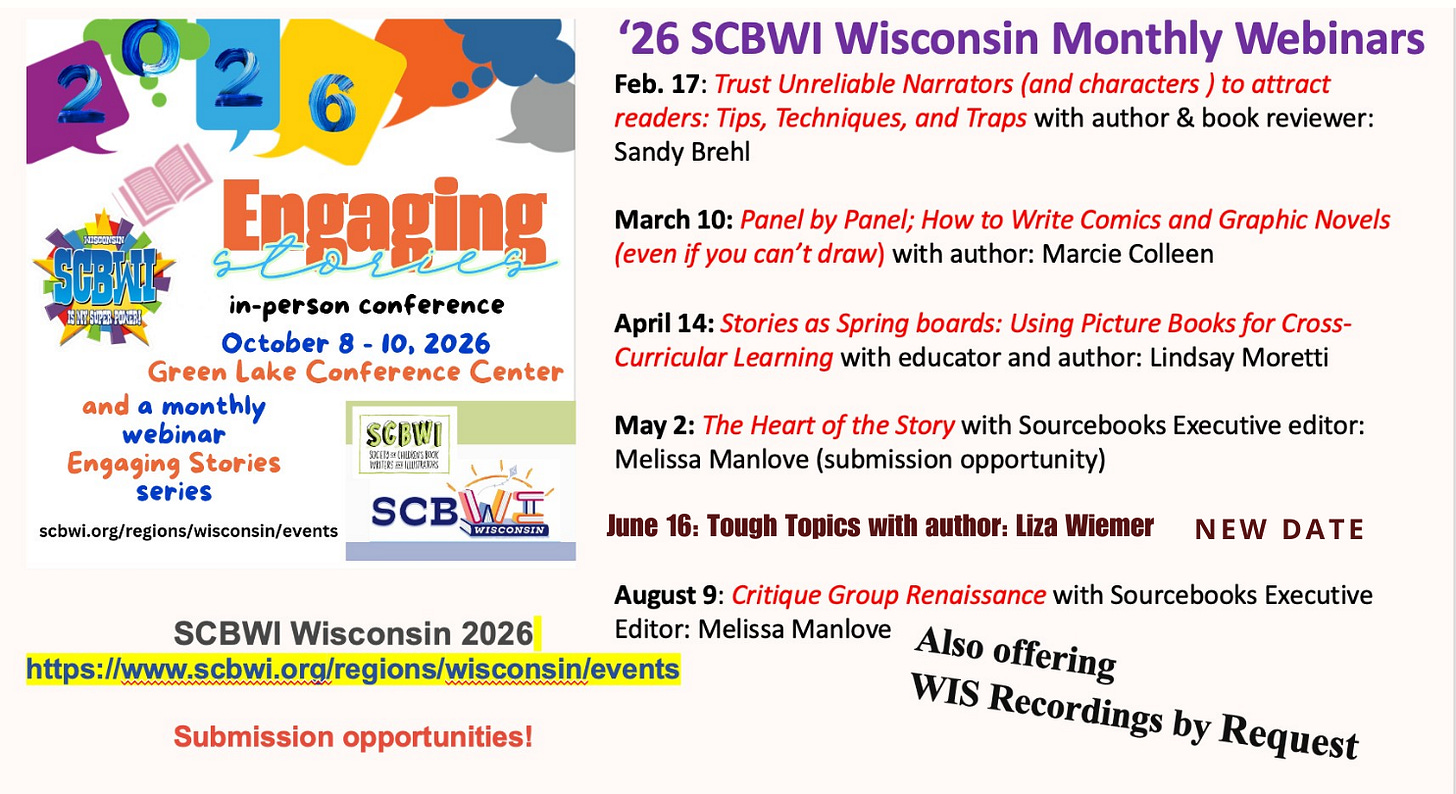 Join me via SCBWI Wisconsin monthly webinars. Registration is open now.